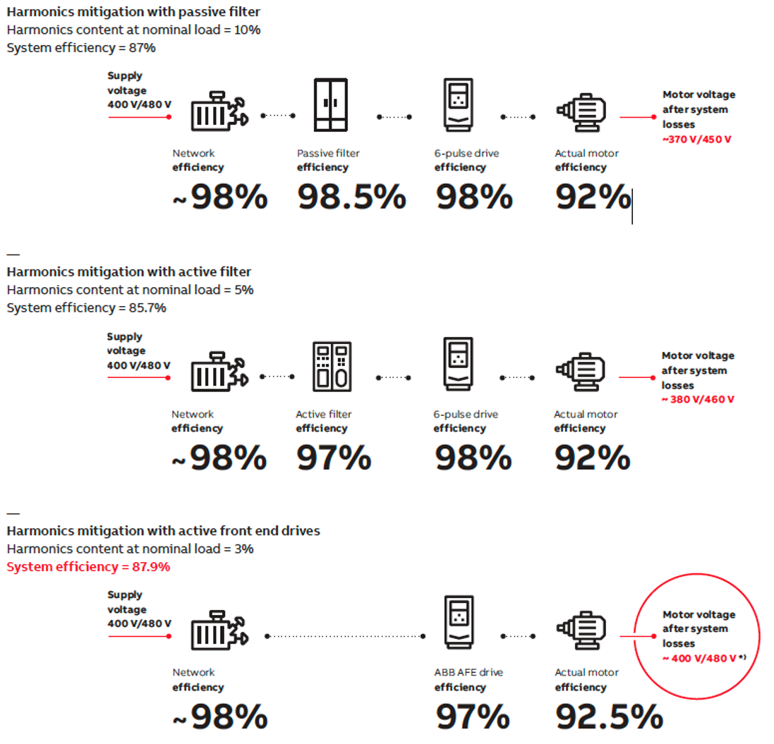 Below is a snapshot from ABBs brochure for the ACS880 highlighting the incredible advantage of using Active Front End(AFE) drives instead of using passive or active filters. The main point being that the AFE has a much higher system efficiency than Active Harmonic Filters(AHF) and Passive Harmonic Filters(PHF) while maintaining a very high THD-reduction.